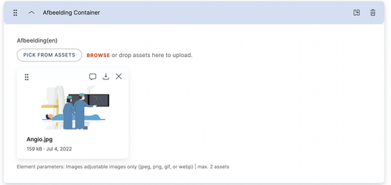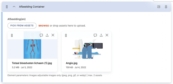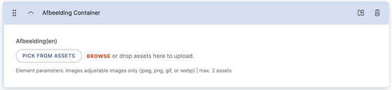 Kies voor het component 'Afbeelding container'. In het component kan je via 'Pick From Assets' één of twee afbeeldingen toevoegen.