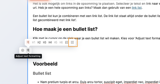 Klik met je cursor op de plek waar je een bullet list wil maken. Kies voor 'Adjust text formatting'. Je ziet nu verschillende tekst opties, waaronder helemaal rechts de bullet list.