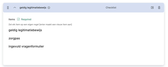 Het component checklist gebruik je als je de gebruiker op een interactieve manier wil helpen met bijvoorbeeld het voorbereiden van taken. Denk aan een lijstje met dingen die de patiënt mee dient te nemen voor zijn of haar afspraak.