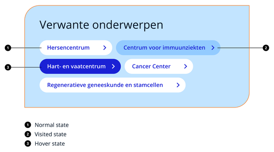 Om gebruikers beter inzicht te geven in waar de informatie op de pagina toe behoort vul je de chip container met directe verwante pagina's. Denk hierbij bijvoorbeeld aan een informatiepagina die onder het Geboortecentrum valt. Een van de chiplinks verwijst dan naar het Geboortecentrum. De chip container is een aanvulling op contextlinks die je op de pagina zet. De voorkeur is altijd om eerst een link list te gebruiken, omdat deze zowel interne al externe links kunnen bevatten en compacter op de pagina staat. Gebruik de chips container enkel om naar grote 'interne onderdelen' te verwijzen. Chip containers verwijzen nooit naar externe bronnen.