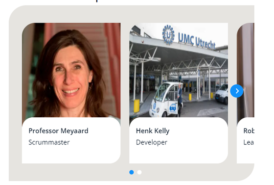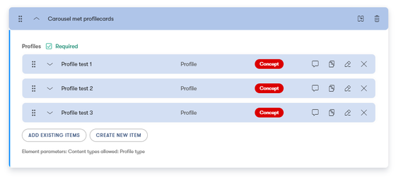 Voor het tonen van personen in een carrousel is de carrousel met profilecards ontwikkeld. In deze carrousel kun je profiles toevoegen. Een profile van een persoon vermeld naam (inclusief titel(s) en voorletters), de functie, een afbeelding en een profiel onderdeel met alle relevante profiel gegevens van de persoon. Dit is vrije tekst.