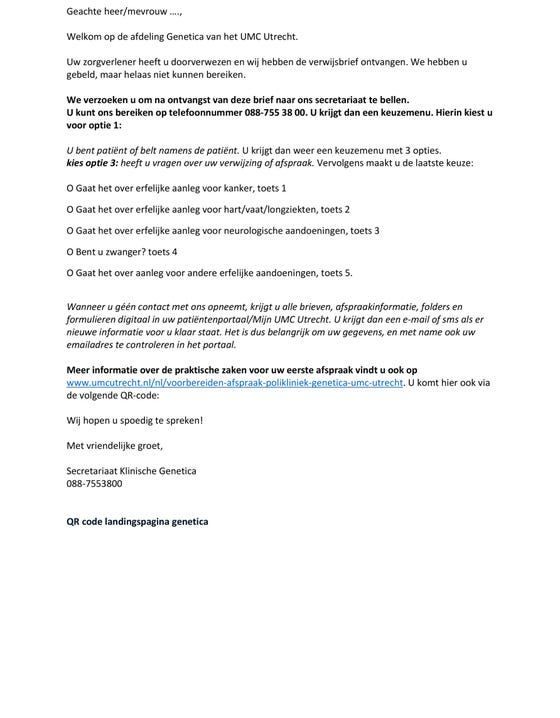 Als de patiënt twee keer niet opneemt, stuurt het UMC Utrecht een welkomstbrief. Naast het welkom is deze brief vooral bedoeld om de patiënt te vragen zelf telefonisch contact op te nemen met het UMC Utrecht.