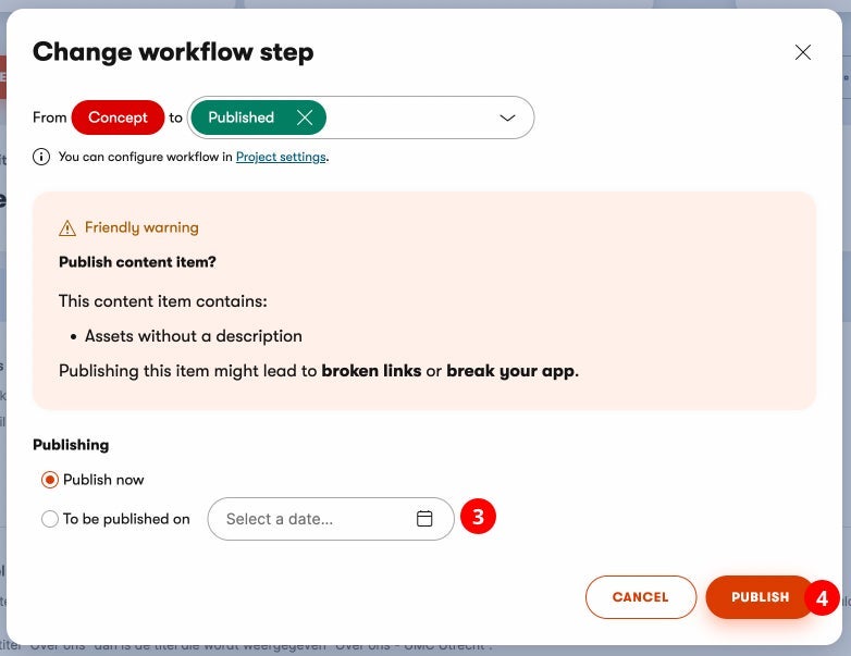Het is ook mogelijk om je pagina vast klaar te zetten en deze op een specifieke datum automatisch te laten publiceren. Dit kun je instellen via "To be published on" (3).