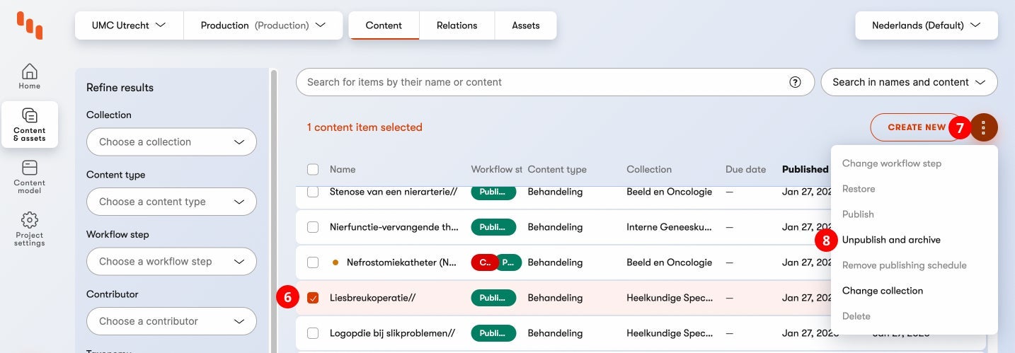 Wil je je pagina offline hebben? Selecteer (6) je pagina dan in het overzicht. Klik daarna op het icoontje met de drie puntjes (7), rechts boven het overzicht. Klik nu op "Unpublish and archive" (8).