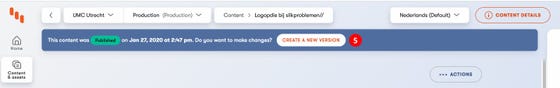 Zodra je pagina gepubliceerd is en je opent deze weer om wijzigen aan te brengen, dan staat er een melding bovenaan je pagina "Create a new version" (5). Klik hierop op je pagina te wijzigen. Je huidige gepubliceerde pagina blijft bestaan tot je weer op publiceren klikt, dan zal de nieuwe versie online beschikbaar zijn.