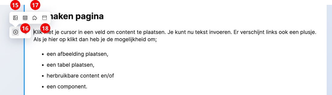 Heb je een component die je vaker wilt gebruiken? Dan is het mogelijk om hier herbruikbare content van te maken. Je maakt een component eenmalig op en zet deze om naar herbruikbare content. Via het plusje (links) verschijnen 4 icoontjes, klik op het 3e icoontje (17), het puzzelstukje om de herbruikbare content te plaatsen.