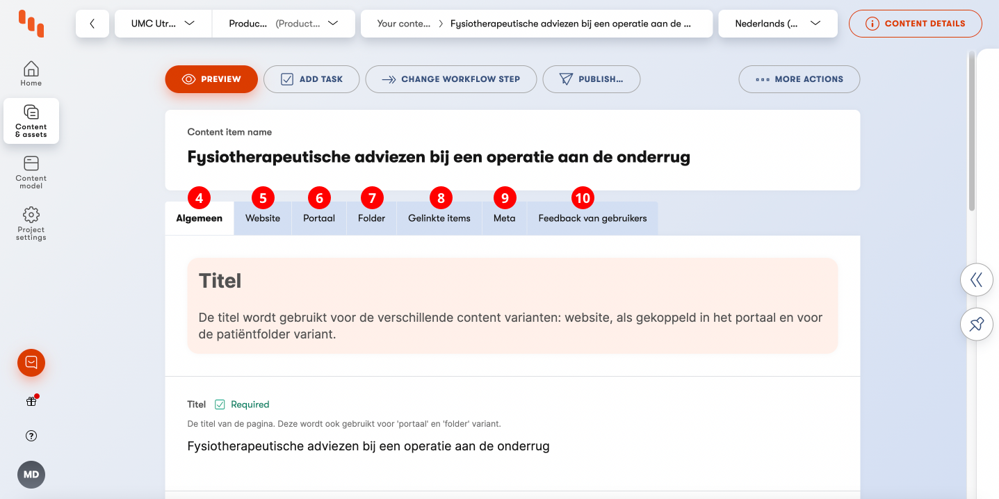 Elk content type pagina bestaat uit meerdere tabs: Algemeen (4), Website (5), Portaal (6), Folder (7), Gelinkte items (8), Meta (9) en Feedback van gebruikers (10). Je start altijd op de tab "Algemeen" (4). Behalve content type ziektebeeld, deze heeft de tab Portaal niet.