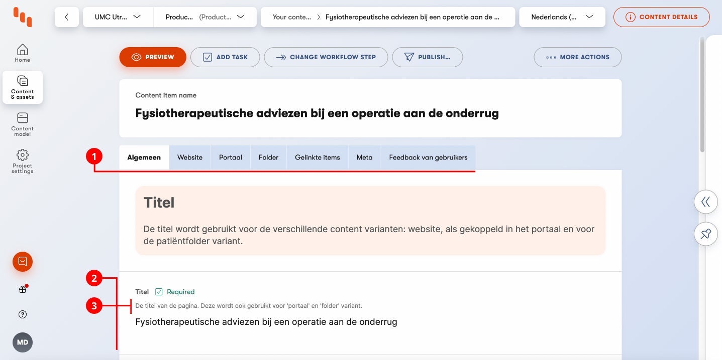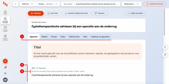 Elk content type pagina heeft zijn eigen tabbladen (1) en velden (2). Lees per veld de guidelines (3) goed en loop alle velden per tabblad door. Niet elk veld is vereist, maar vul de velden die vereist zijn in.