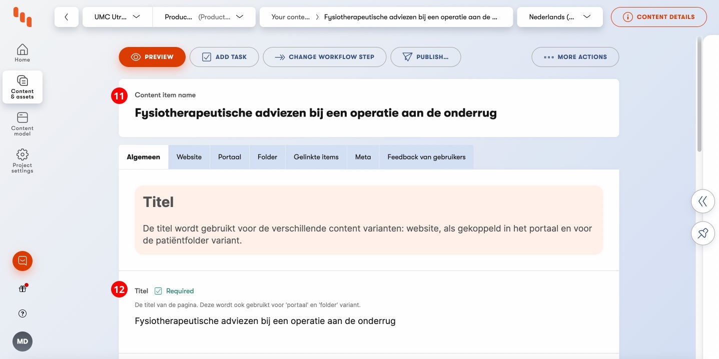 In het veld "Content item name" (11) voer je de titel in die goed vindbaar is om een content item (terug) te vinden in Kentico. Het veld "Titel" (12) zie je terug als titel op zowel de website, het patiëntenportaal en de folder.