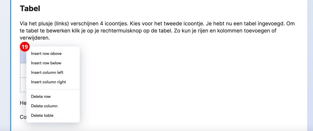 Via het plusje (links) verschijnen 4 icoontjes. Kies voor het 2e icoontje (16). Je hebt nu een tabel ingevoegd. Om te tabel te bewerken klik je op je rechtermuisknop op de tabel (19). Zo kun je rijen en kolommen toevoegen of verwijderen.