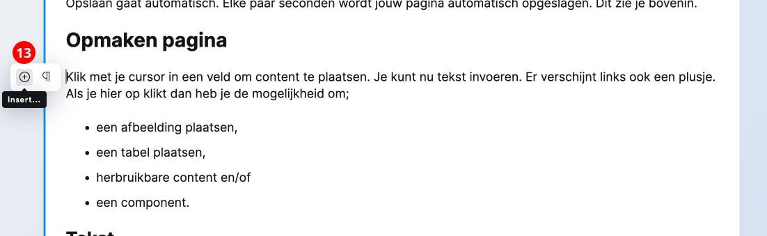 Klik met je cursor in een veld om content te plaatsen. Je kunt nu tekst invoeren. Er verschijnt links ook een plusje (13). Als je hier op klikt dan heb je de mogelijkheid om;