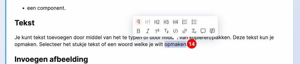 Je kunt tekst toevoegen door middel van het te typen of door middel van kopiëren/plakken. Deze tekst kun je opmaken (14). Selecteer het stukje tekst of een woord welke je wilt opmaken. Heb je een titel? Kies dan een H2/H3 of H4. Is het in de lopende tekst? Maak deze dan bold, cursief, superscript, subscript of voeg een link toe. Ook maak je via deze selectie een opsomming met opmaak.
