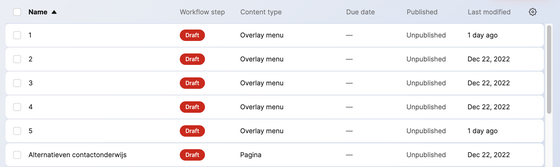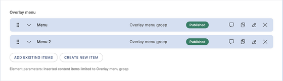 Om dit menu in te stellen gebruik je het content-type Overlay menu, dus NIET de Overlay menu groep die we hiervoor bij de Single Overlay-menu gebruikten.