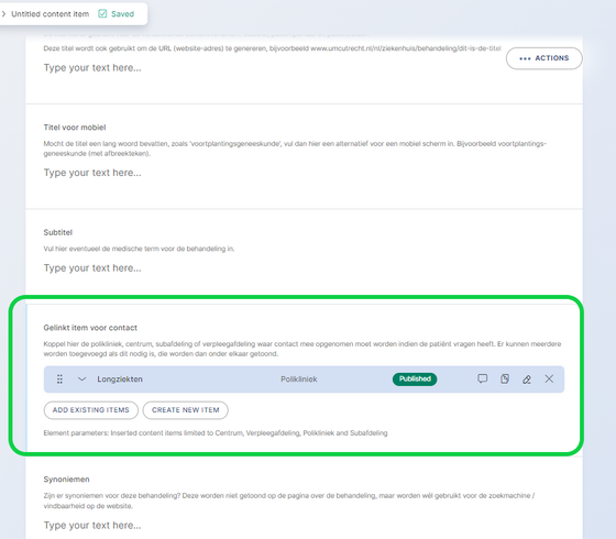 Blijf in het tabblad 'Algemeen'. Ga naar het onderdeel 'Gelinkt item voor Contact'. Hier voeg je de juiste polikliniek, centrum, subafdeling of verpleegafdeling toe.