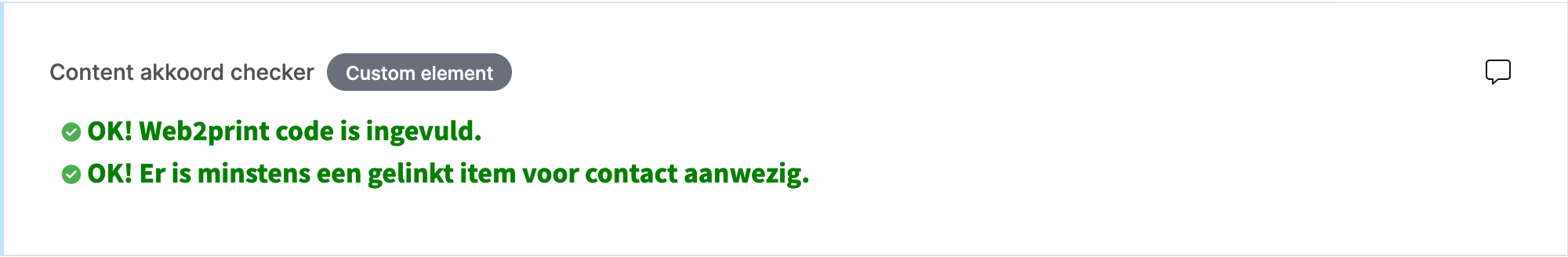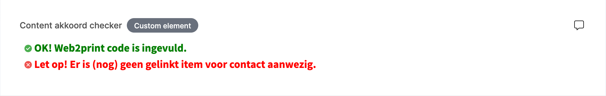 Dit veld checkt of het "Gelinkt item voor contact" en het "web2print nummer" is ingevoerd op het tabblad algemeen. Als deze juist ingevuld zijn dan zal de content akkoord checker beiden als groen markeren. Ontbreken er gegevens? Dan laat de content akkoord checker zien welk onderdeel er ontbreekt.