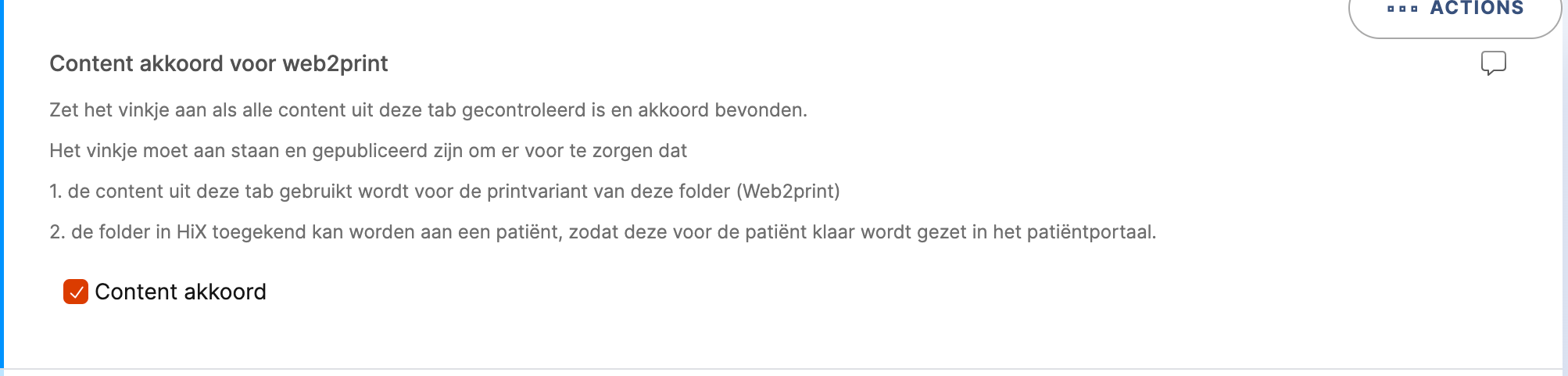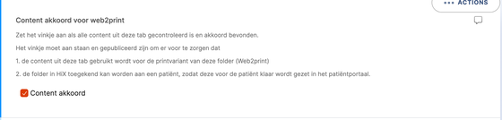 Web2print en patiëntbibliotheek staan los van elkaar. Je hoeft ze dus niet beiden aan te vinken. Het kan namelijk ook zijn dat je folderinformatie hebt, maar dat deze niet geprint hoeft te worden. De opties zijn dus om ze beiden aan te vinken of dat je alleen kiest voor web2print of alleen voor patiëntbibliotheek.