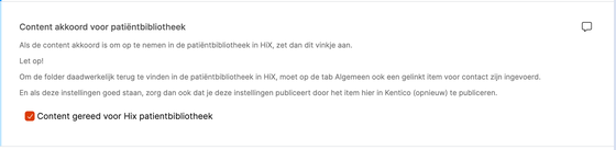 Als je je folder beschikbaar wilt stellen in het patiëntportaal let dan ook op dat je "Gelinkt items voor contact" hebt ingevuld bij tabblad Algemeen. Daarna vink je "Content gereed voor HiX patiëntbibliotheek" aan.