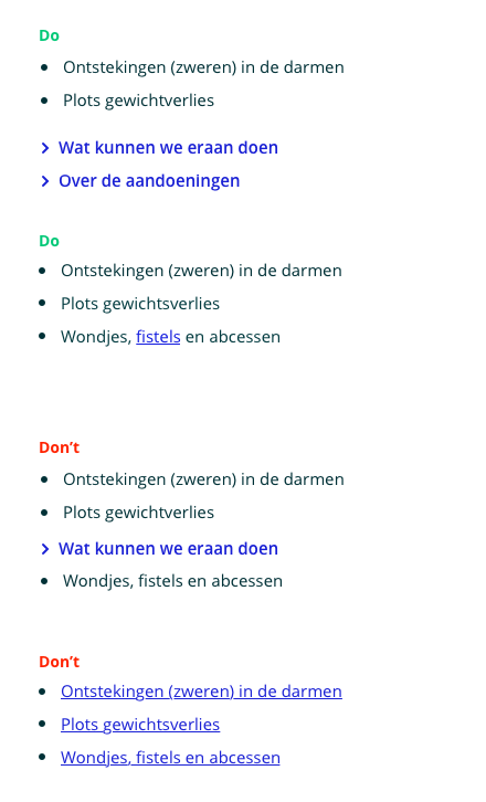 Een linklist gebruik je bijvoorbeeld wanneer je aan het eind van een paragraaf naar meerdere externe websites/bronnen wilt verwijzen. Een linklist is een opsomming van links en alleen daarvoor bedoeld. Een bullitlist of tekstuele opsomming gebruiken we niet als lijst met links. Je gebruikt deze twee manieren van opsommen dus na elkaar en niet door elkaar.