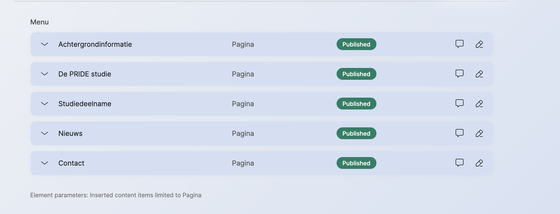- Voeg hier bestaande pagina toe of maak nieuwe pagina's aan. De volgorde in deze lijst, bepaalt de volgorde waarop ze in de site getoond worden.