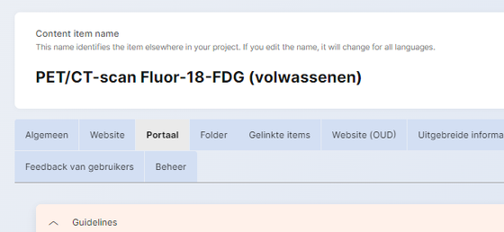 Elk item van deze types heeft verschillende tabs. Er zijn 3 tabs voor 3 verschillende varianten van de tekst. Deze varianten zijn: Website, Portaal en Folder: