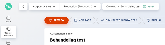 Kentico Kontent slaat wijzigingen in een concept automatisch op. Als bovenaan het scherm 'Saved' staat, zijn je wijzigingen opgeslagen. Na enige tijd verdwijnt deze melding.
