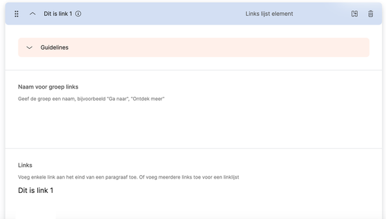 Kies voor het component 'Link lijst element'. In het veld "Links" voeg je één link toe door middel van tekst.