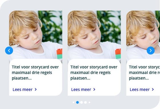 Storycards worden in een container gegroepeerd. Dit kunnen meerdere cards zijn. Maak de containers onderdeel van een sectie in plaats van een extra titel erboven. Een storycard bestaat uit een foto, titel en een link naar de onderliggende pagina.