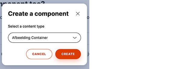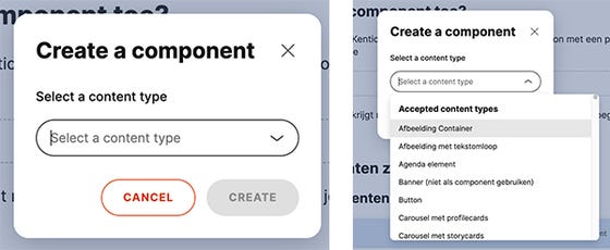 Er verschijnt een popup venster "Create a component". Klik op "Select a content type". Selecteer dan uit de lijst welk component je in je pagina wilt hebben. Bijvoorbeeld "Afbeelding Container".