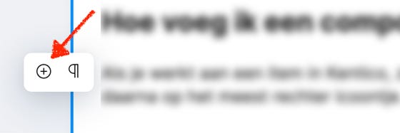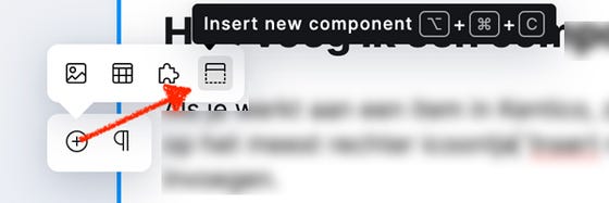 Als je werkt in een item in Kentico, verschijnt er automatisch op de plek van je cursor een icoon met een plusje. Klik hierop en klik daarna op het meest rechter icoontje "Insert new component".