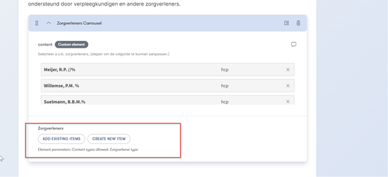 Zorgverleners carrousel binnen Corporate sites-project is aangepast om zorgverleners als linked items te kunnen toevoegen. Dit betekent dat bij een wijziging in het carrousel deze volledig moeten worden overgenomen in het nieuwe veld zorgverleners.