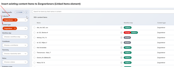 Selecteer bij Collection Zorgverleners en als Content-type Zorgverlener.