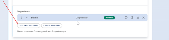Om zorgverleners aan de carrousel te kunnen toevoegen, klik op de knop ADD EXISTING ITEMS.